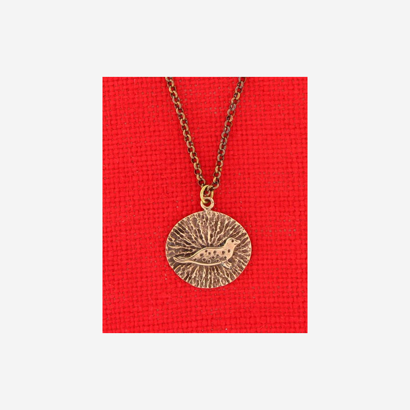 Alle Bronzeschmuckstücke sind durch einen Speziallack geschützt Schmuckserie mit arktischen Tieren. Der Hintergrund des Schmuckstückes ist der Abguss einer Wirbelscheibe eines Seehundes, den wir 1984 in Neu-Ålesund auf Spitzbergen gefunden haben. Die Anhänger Seehund und Schneehuhn können beiderseitig getragen werden.Alle Tiere, bis auf den Eisbären, kommen auch bei uns in Finnmark vor.