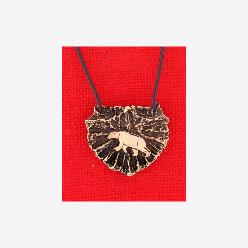 Alle Bronzeschmuckstücke sind durch einen Speziallack geschützt. Schmuckserie mit arktischen Tieren. Der Hintergrund des Schmuckstückes ist der Abguss einer Wirbelscheibe eines Seehundes, den wir 1984 in Neu-Ålesund auf Spitzbergen gefunden haben. .Alle Tiere, bis auf den Eisbären, kommen auch bei uns in Finnmark vor.