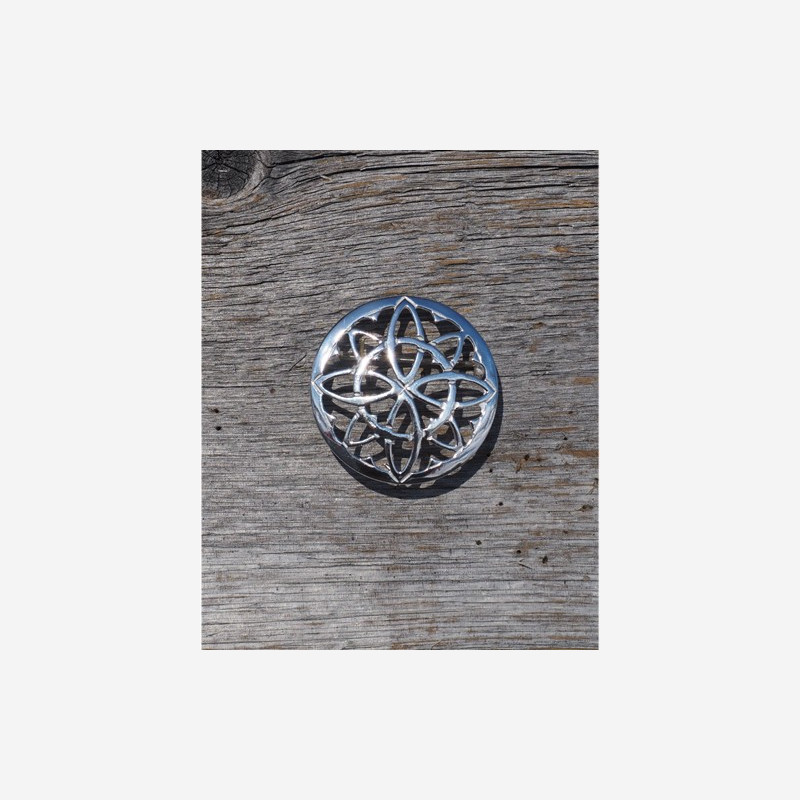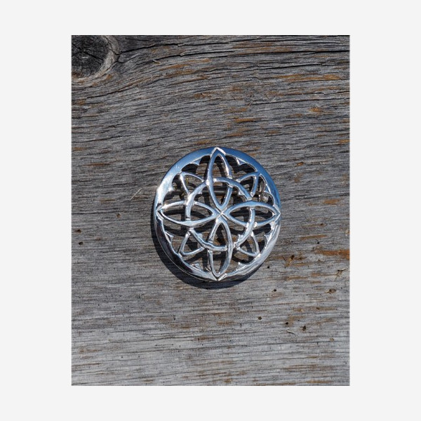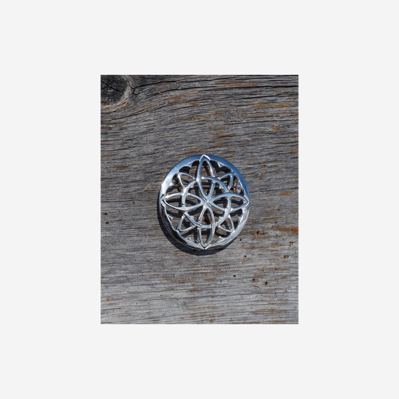 Die Samenfrauen befestigten große runde Gürtelschmuckstücke aus Metall oder Rentierhorn an der Seite ihrer breiten Ledergürtel. Unter diese Gürtelschmuckstücke wurden Messer, Löffeltasche, Scherenfutteral, Nadelhaus und Geldbörse gehängt. Wenn die Samenfrauen an den Rentierzügen teilnahmen, kamen noch diverse Schlüssel für die Speicher und Schatzkisten dazu. Die Vorbilder einiger unserer Gürtelschmuckstücke, die bei uns zu Broschen und Anhängern verarbeitet werden, stammen aus dem Mittelalter. Sie wurden vor einigen Jahrzehnten bei Ausgrabungen von samischen Opferplätzen in Schweden gefunden. Die Forscher vermuten, daß die Motive der Schmuckstücke Sonnenräder darstellen, und daher bekamen die Schmuckstücke ihren Namen Sonnenrad. Der Name ist modern und kam erst mit der Etablierung der Silberschmieden in Finnmark auf. Auch Modelle aus Rentierhorn haben als Vorbilder gedient, diese waren jedoch nicht so groß wie die Gürtelschmuckstücke aus Metall. Alle Sonnenräder mußten stark verkleinert werden, damit sie als Schmuck für unsere heutige Kundschaft verwendet werden können.