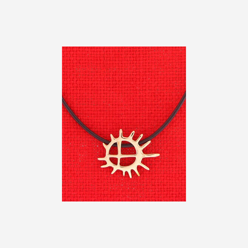Alle Bronzeschmuckstücke sind durch einen Speziallack geschützt. Die Mitternachtssonne ist im Land der Samen ein Naturphänomen von grösster Bedeutung. Sie ist auf fast allen bewahrten Schamanentrommeln, direkt oder indirekt, abgebildet. Die Sonne ist oft bis ins nicht wiederzuerkennende stilisiert abgebildet. Das Vorbild für unsere Sonne stammt von einer Schamanen Trommel aus der Åsele- Lappmark Die Trommel ist seit 1693 bekannt, kann aber auch älter sein. Ernst Manker gir uttrykk for at sola ikke ble ansett som en gudefigur men som den u-personifiserte urkraften som er skaperen selv. Die Sonne der Trommel ist von uns designmässig verändert. Sie ist seit dem Anfang der 80-iger Jahre unsere registrierte Firmenmarke. Kilde: Ernst Manker, Die lappische Zaubertrommel. Bind 1, Runebom nr. 65