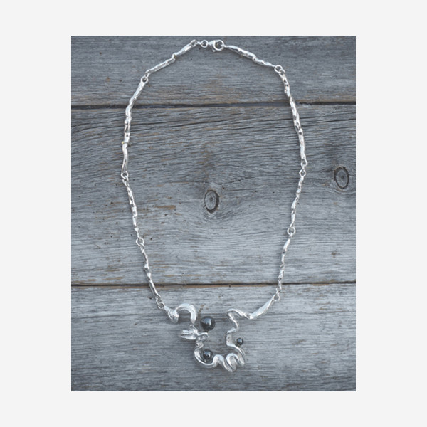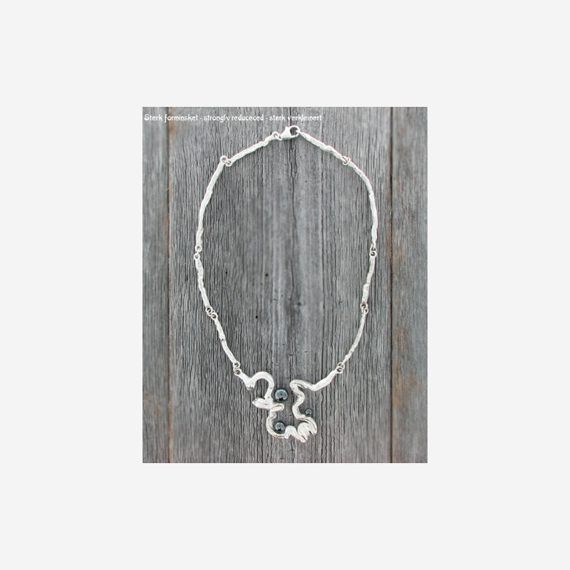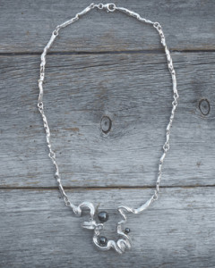 Wir verwenden Krähenbeerenwurzeln für die Schmuckmodelle. Die schwarzen "Beeren" auf dem Silberschmuck sind Hematitkugeln (Blutstein) der genau die gleiche Farbe haben wie die Krähenbeeren.