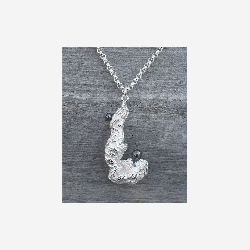 Wir verwenden Krähenbeerenwurzeln für die Schmuckmodelle. Die schwarzen "Beeren" auf dem Silberschmuck sind Hematitkugeln (Blutstein) der genau die gleiche Farbe haben wie die Krähenbeeren. Ganz massiv, hohes Gewicht!