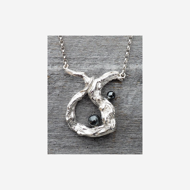 Wir verwenden Krähenbeerenwurzeln für die Schmuckmodelle. Die schwarzen "Beeren" auf dem Silberschmuck sind Hematitkugeln (Blutstein) der genau die gleiche Farbe haben wie die Krähenbeeren. Ganz massiv, hohes Gewicht!