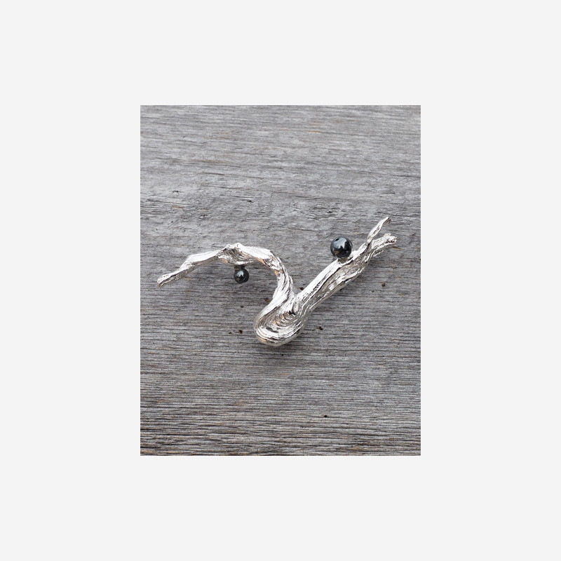 We use dried crowberry roots for designing this special silverjewelry. The black pearls are made of hematit (bloodstone) which is just as black in colour as the crowberries in nature.