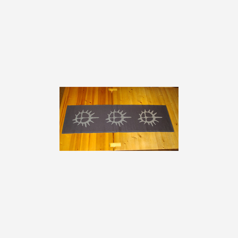 Textile of beautiful quality, woven for us in Sweden, according to our own design. 45% linen / 55% cotton Color: Black colored background, and linen coloured woven pattern. The midtnightsun is a important natural phenomenon for the sami people. The sun is painted on almost every preserved sami sjaman drum. The sun is often stylized beyond recognition but our sun is inspired by a drawing of a drum from Aasele Lappmark/Sveden. This drum has been known since 1693 but may be much older than this. Ernst Manker stated that the sun was not seen as a divine figure but as the u-personified power of the universe, that is the creator himself.