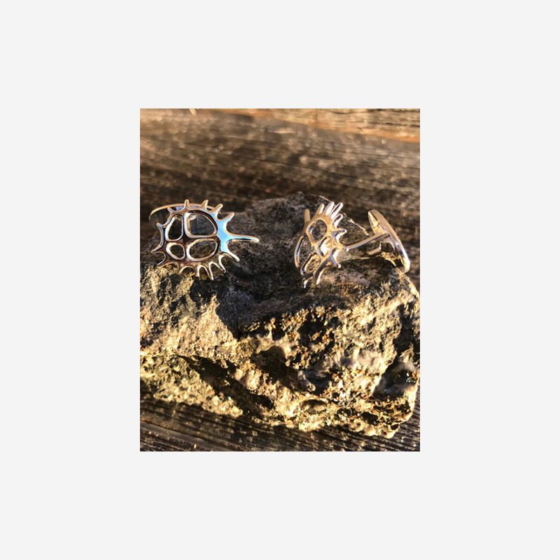 The midtnightsun is a important natural phenomenon for the sami people. The sun is painted on almost every preserved sami sjaman drum. The sun is often stylized beyond recognition but our sun is inspired by a drawing of a drum from Aasele Lappmark/Sveden. This drum has been known since 1693 but may be much older than this. Ernst Manker stated that the sun was not seen as a divine figure but as the u-personified power of the universe, that is the creator himself. Kilde: Ernst Manker, Die lappische Zaubertrommel. Bind 1, Runebom nr. 65