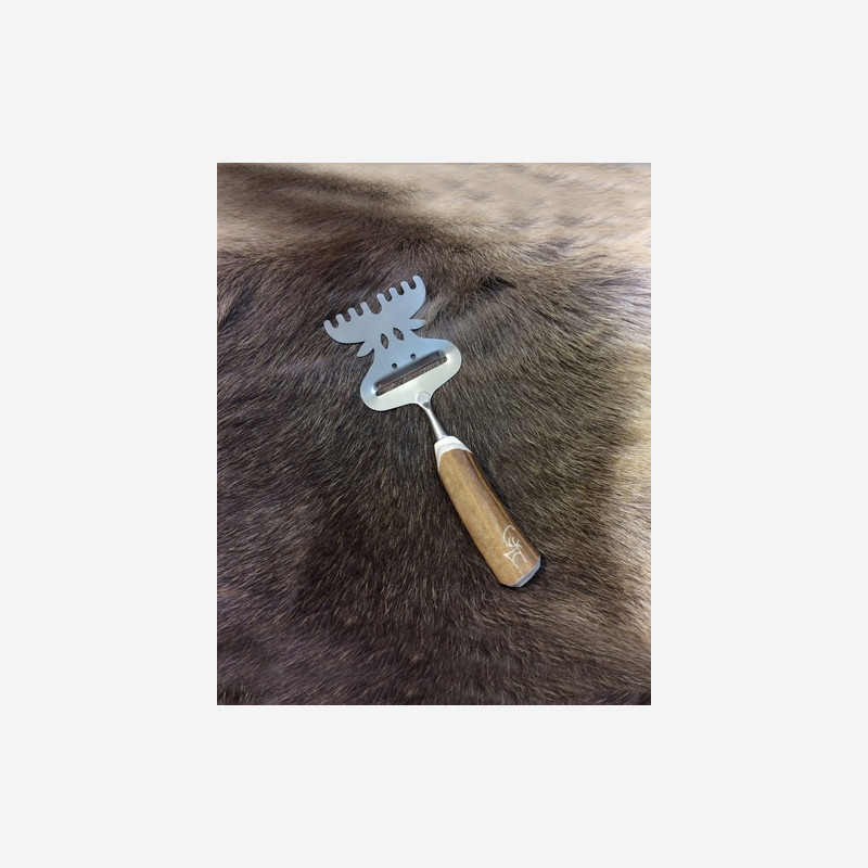 Cheese slicer with moose, handle of reindeer antler. Not for the dishwasher please.