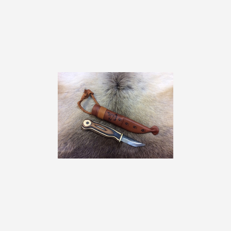 Samekniv med meget pene valbjørk knivskaft. En spesiell plastbit i slira sørger for økt sikkerhet sikkerhet. Pene og rimelige kniver for daglig bruk. Der preget på slira, det kan derfor ikke velges hvilket dyr som er preget på sliren.