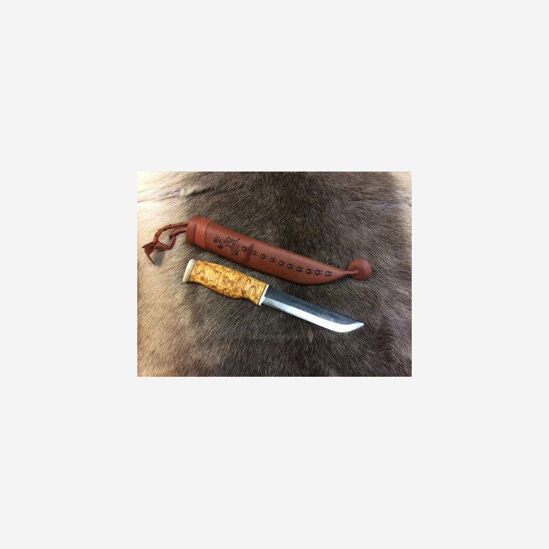 Samekniv med meget pene valbjørk knivskaft. En spesiell plastbit i slira sørger for økt sikkerhet. Pene og rimelige kniver for daglig bruk. Dyrefigurer (elg, rein, rype ect med tilhørende sportegn) er preget på slira, det kan derfor ikke velges hvilket dyr som er preget på sliren. Bladet er av karbonstål. Kniven må derfor ikke settes våt i sliren , den må tørkes av etter bruk.