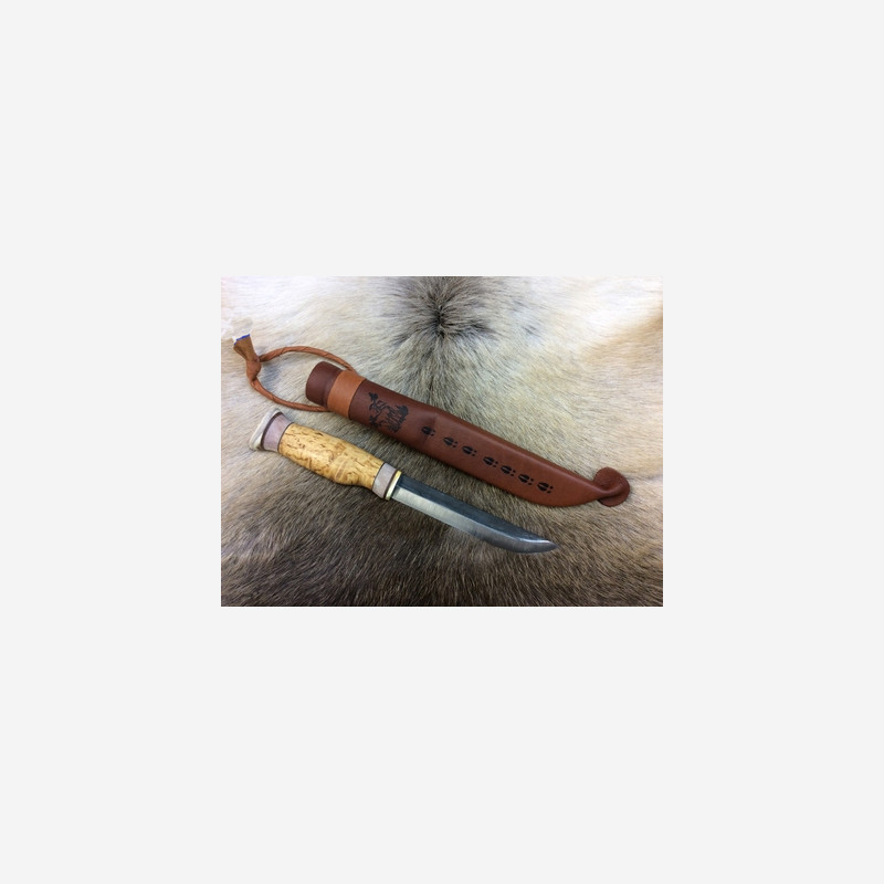 Samekniv med meget pene valbjørk knivskaft. En spesiell plastbit i slira sørger for økt sikkerhet. Pene og rimelige kniver for daglig bruk. Dyrefigur er preget på slira, det kan derfor ikke velges hvilket dyr som er preget på sliren. Bladet er av karbonstål. Kniven må derfor ikke settes våt i sliren , den må tørkes av etter bruk.