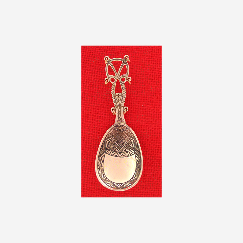 Varen er sterk forminsket på bildet, vennligst finn frem til størrelsen under "Produktdetaljer" Alle bronse-smykker er beskyttet av en spesiell bronse-lakk. Vi anbefaler å bruke bronse skjer som sukkerskje. SAMESKJEER Skjeene var spesielt laget for det samiske markedet. Samene sendte reinhorn-skjeer som modeller til sølvsmeder i Sør-Norge eller i Nord-Sverige . Etter disse reinhorn-modellene ble det laget sølvskjeer som samene brukte som spiseskje. Alle hadde sin egen skje i en pose festet til beltet. Når man ser på møstrene til gamle skjeer av reinhorn viser det seg at samene ofte brukte en metallskje som forbilde for sine egne reinhornskjeer. Mange samiske sølvskjeer er dermed en kopi av en hornskje som igjen er en kopi av en metallskje. Dermed oppsto det en egen stil med spesielle former og stilistiske trekk. Sølvskjeene var ofte utstyret med løse ringer. Så langt en vet var ringene var bare til pynt og hadde ingen symbolsk eller praktisk betydning. To av våre sølvskjeer er direkte laget etter gamle reinhornskjer som er funnet her i distriktet.